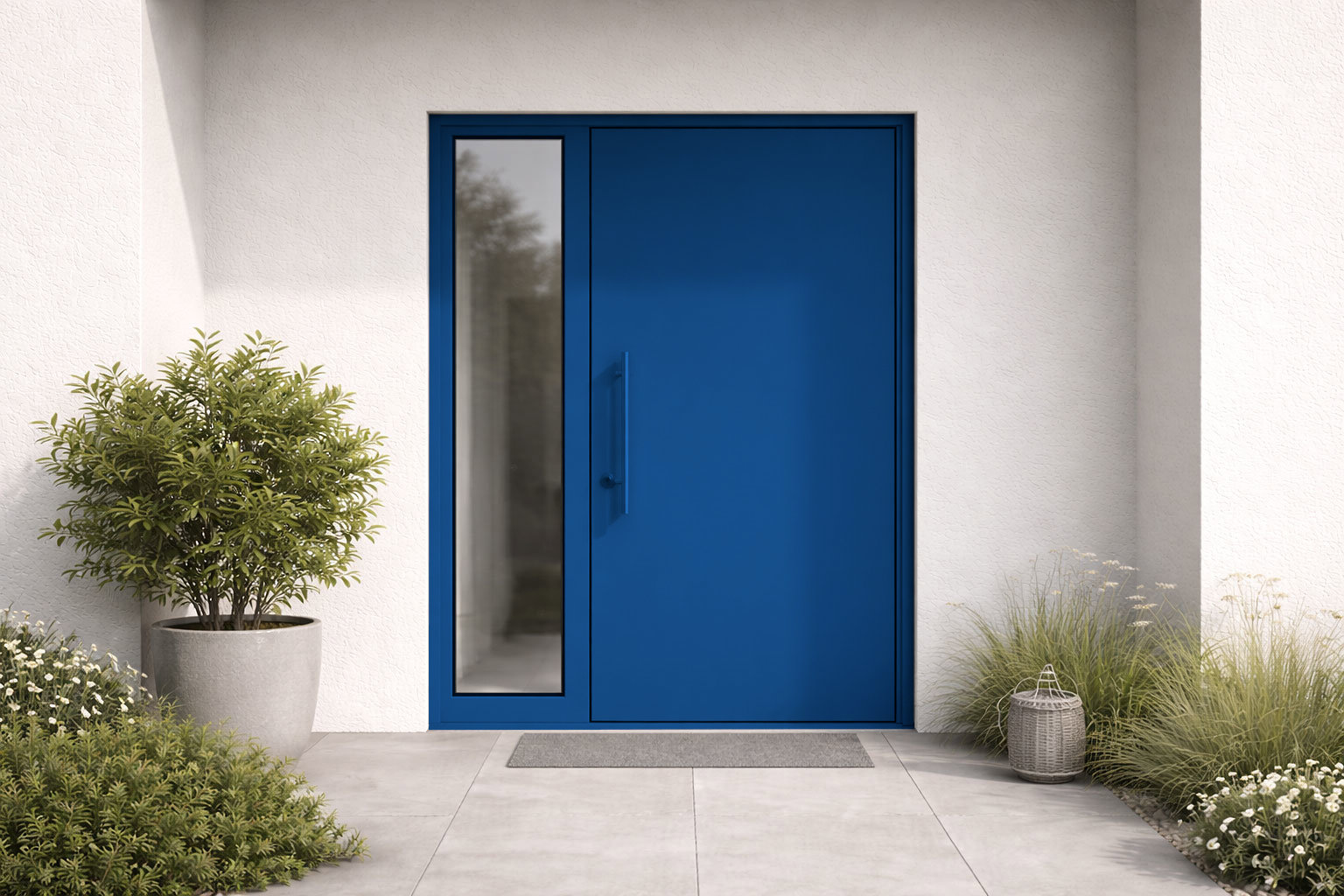 Ein helles Mittelblau für Informationsschilder; helles Licht lässt dieses Blau mit industrieller Klarheit hervortreten, während es im Schatten ein mittleres Blau bleibt, die Universalfarbe für Hinweisschilder und öffentliche Dienste.