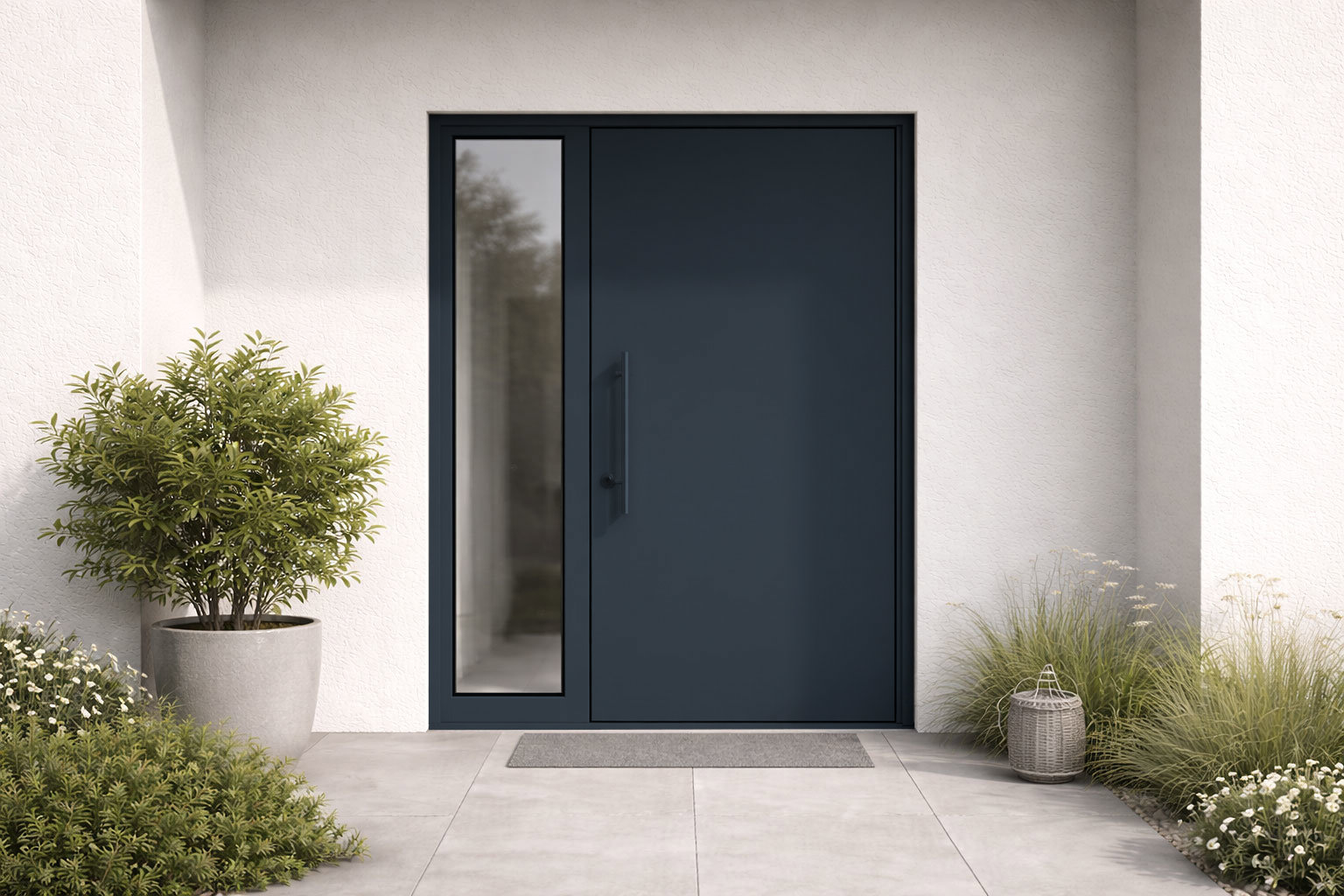 Ein gedecktes, entsättigtes Blau mit starkem Graustich; die Sonne bringt den blaugrauen Schiefercharakter hervor, während es im Dunkeln als kalter, dunkler Neutralton erscheint, verwendet für moderne Gebäudefassaden und Bedachungen.